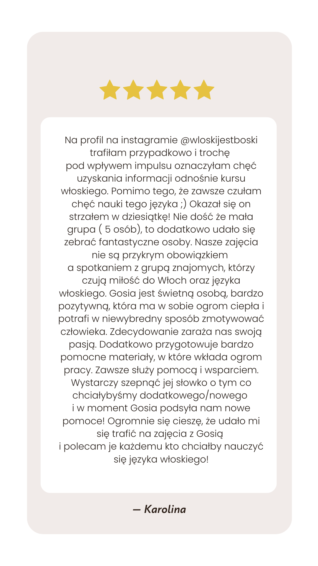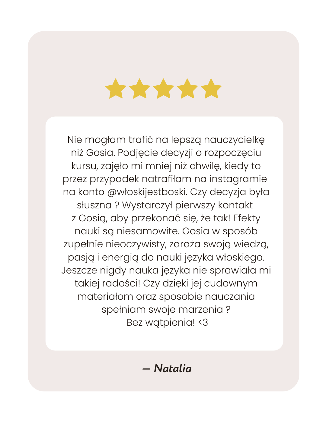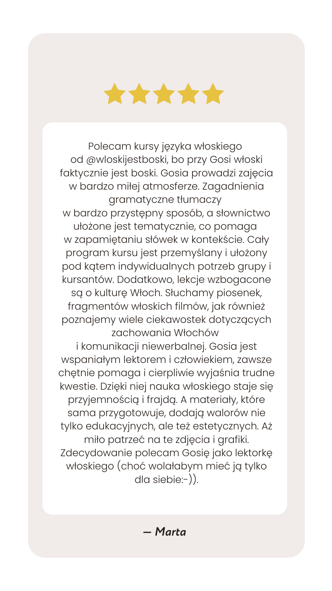 Mam na imię Gosia i od 10 lat uczę języka włoskiego, od pięciu lat prowadzę profil @wloskijestboski, gdzie pokazuję, że włoski jest naprawdę boski i to nie tylko dzięki dziełom Michała Anioła, cudownym pejzażom czy smacznej kuchni. Z ogromną przyjemnością wprowadzę Cię w świat tego wspaniałego języka.