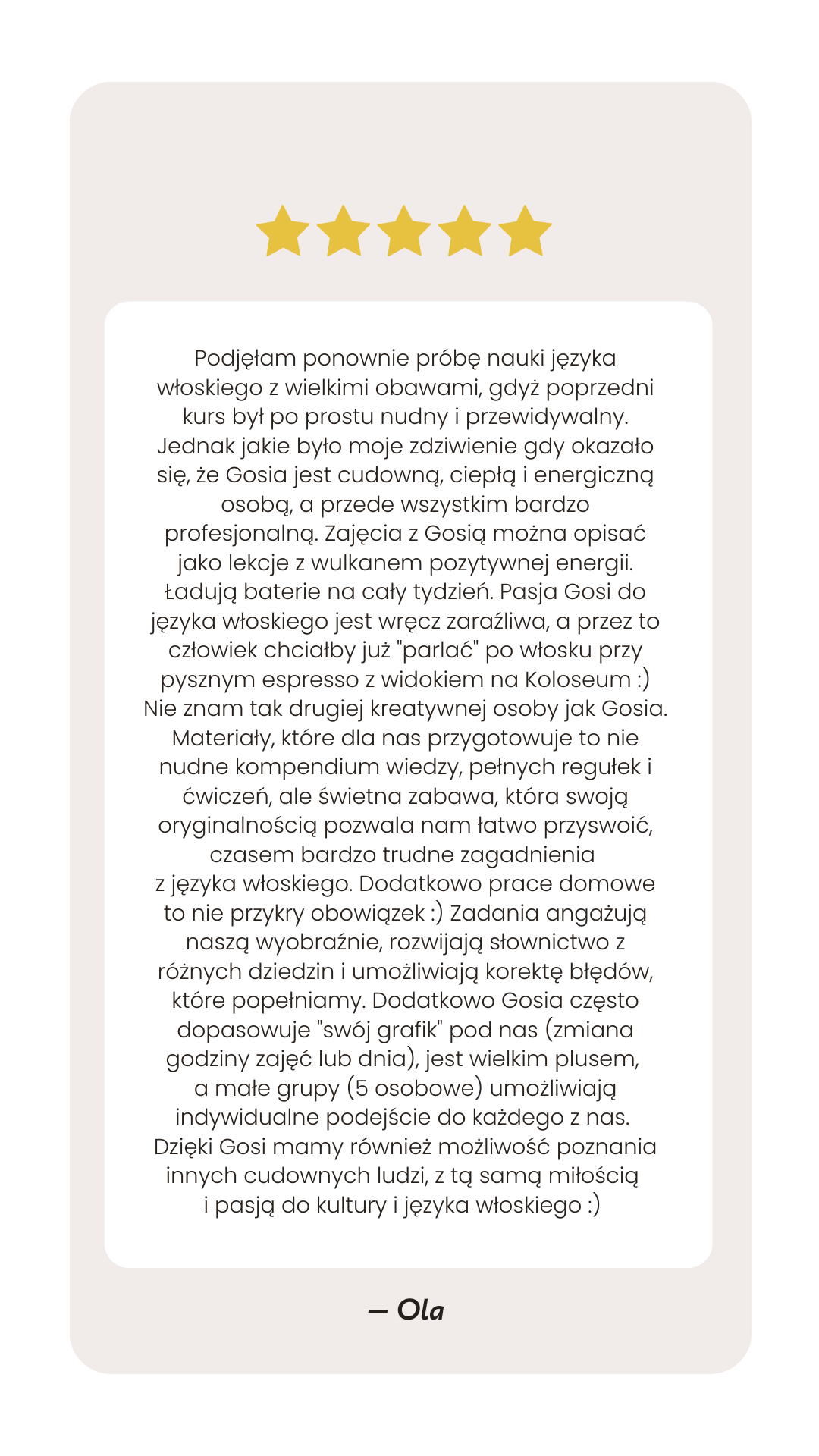 Po studiach mieszkałam w Bolonii, a po powrocie do Polski skończyłam również tłumaczenia z języka włoskiego. Na co dzień pracuję z językiem włoskim oraz dodatkowo zarażam pasją do tego języka także innych, prowadząc kursy grupowe oraz lekcje indywidualne.